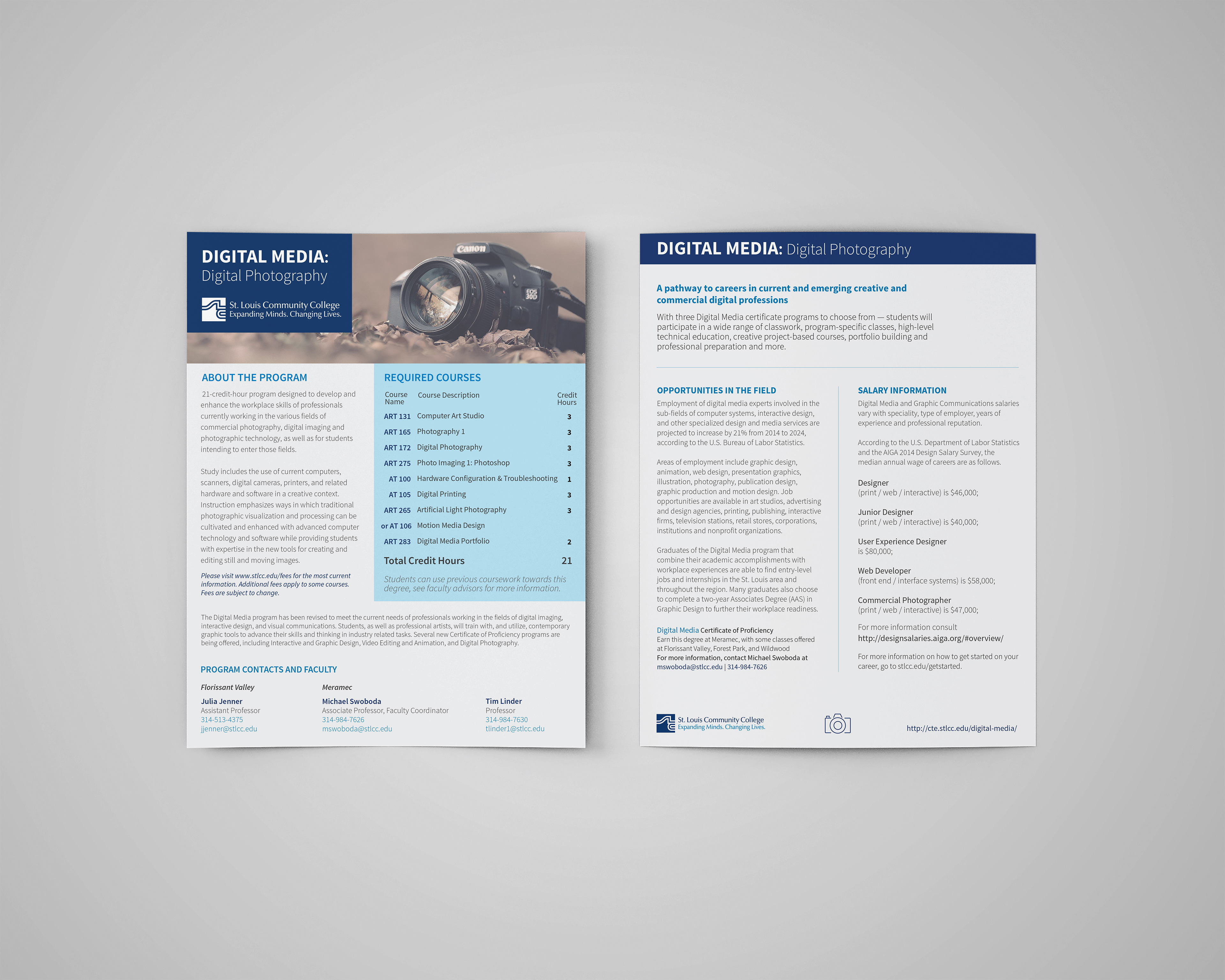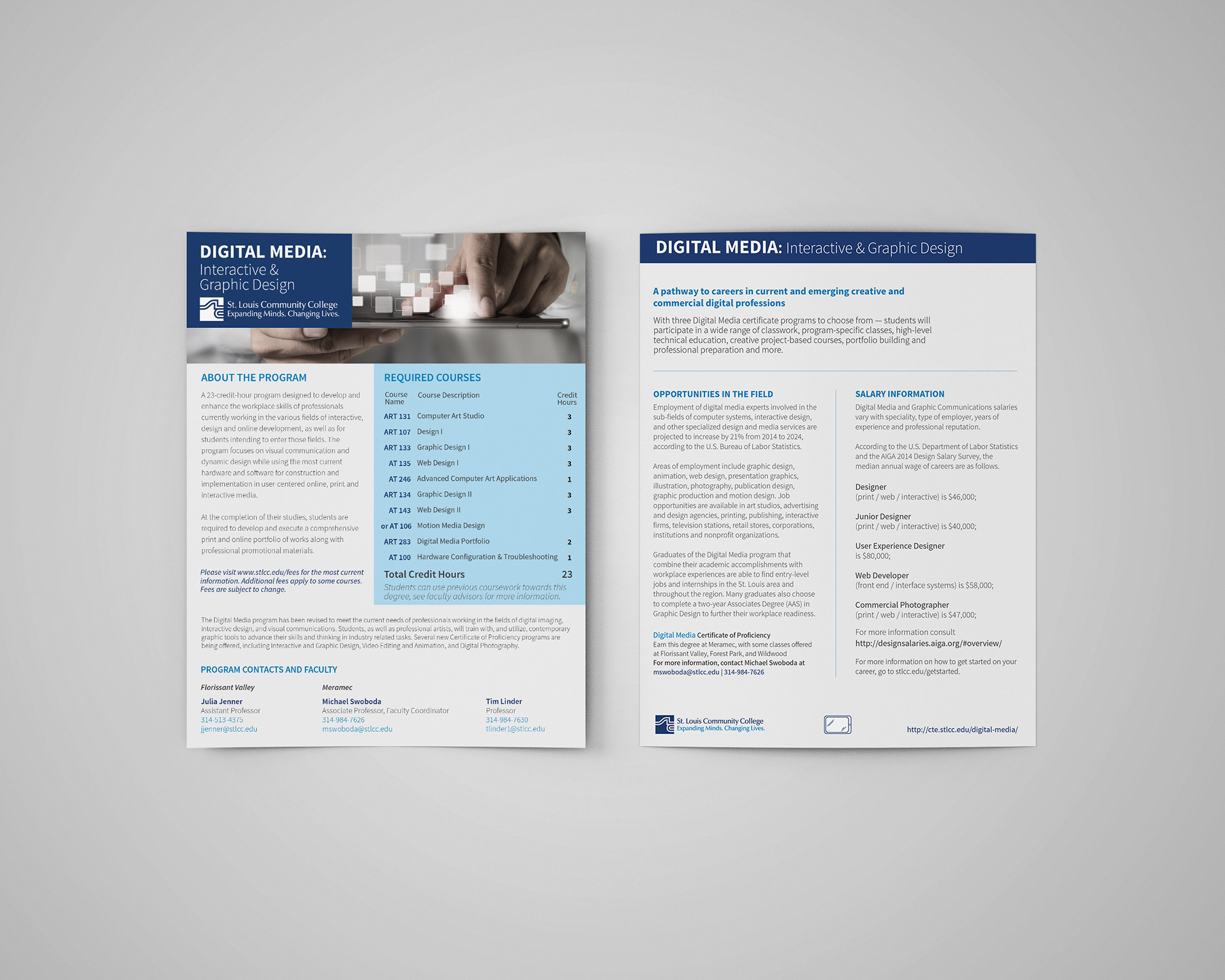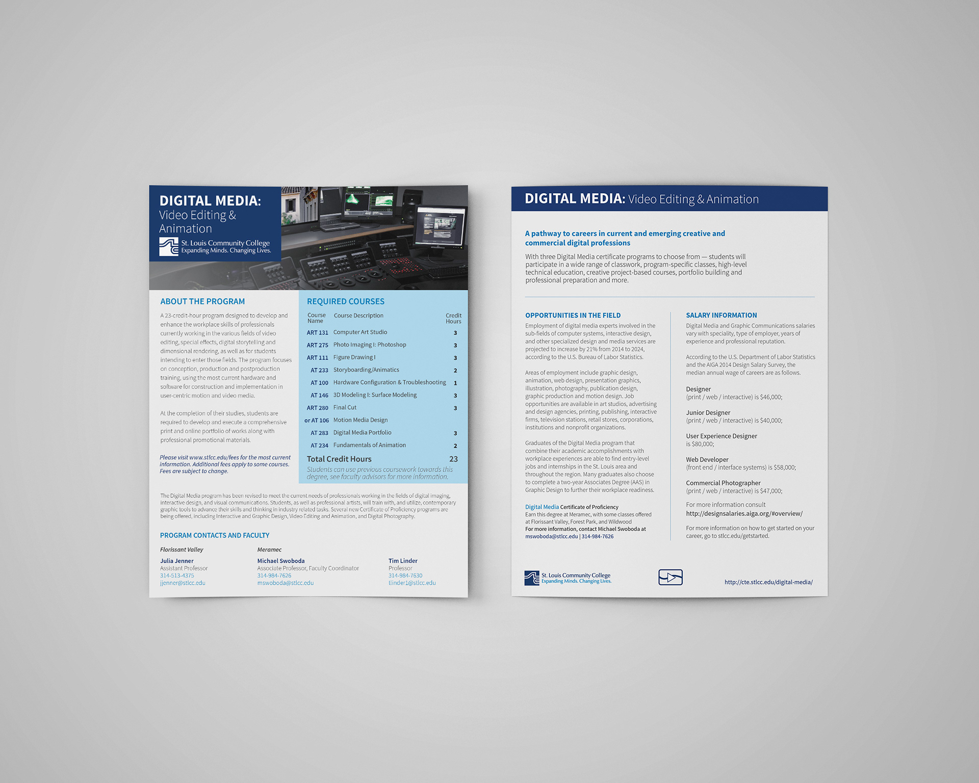 In this project I was instructed to take a body of text that outlined the descriptions of three programs in a degree field. On the back of each flyer is further information about design opportunities in the field and salary information.